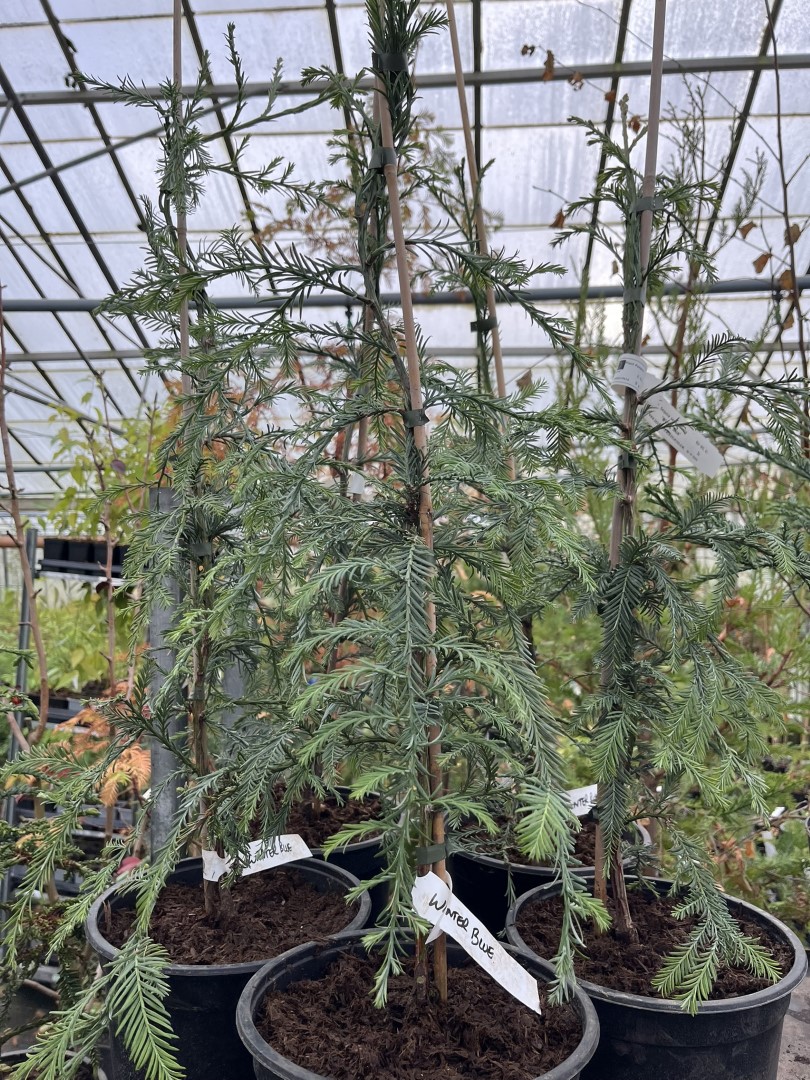 The needles of Sequoia sempervirens ‘Winter Blue’ display a beautiful blue-green hue throughout the growing season, but it’s during the cooler months that this cultivar truly lives up to its name. The winter colour intensity creates a spectacular focal point, particularly effective when frost or morning dew catches the foliage.
