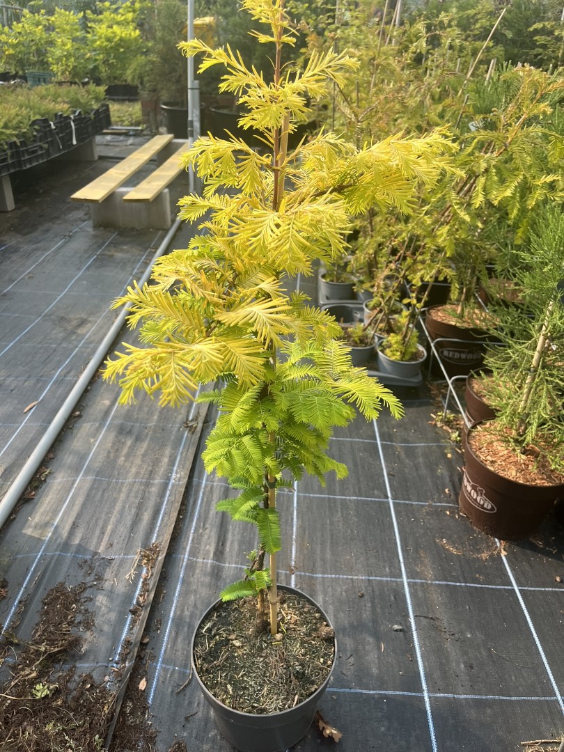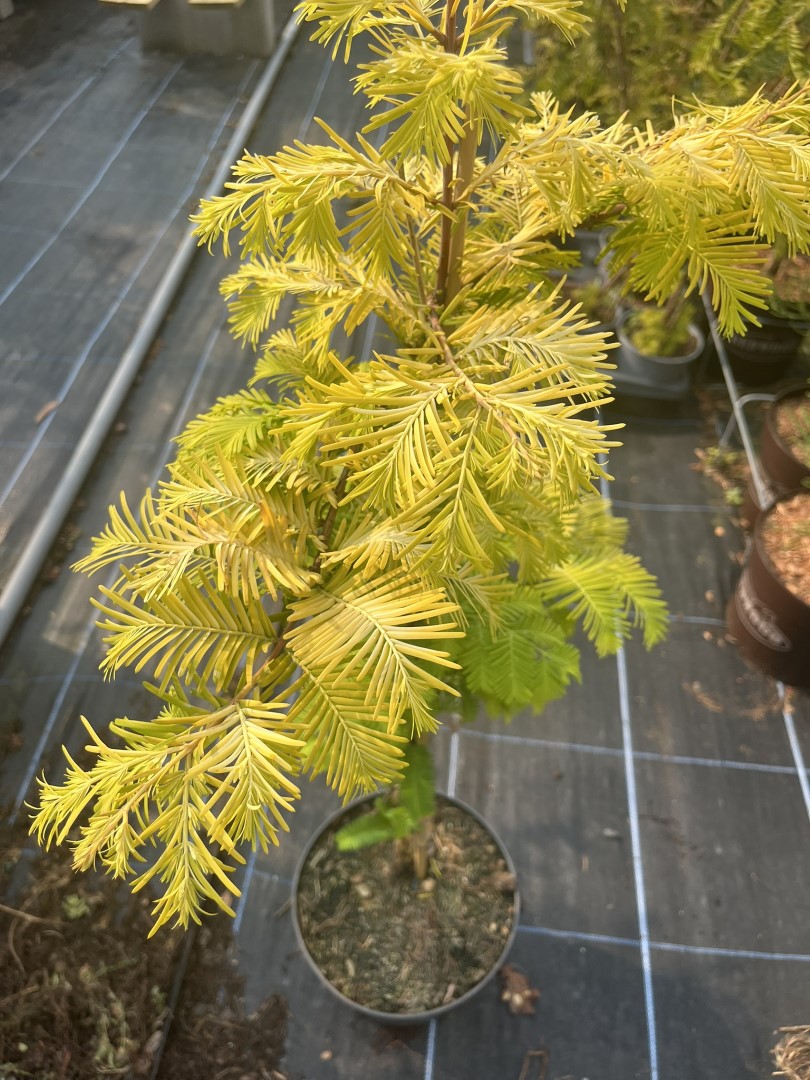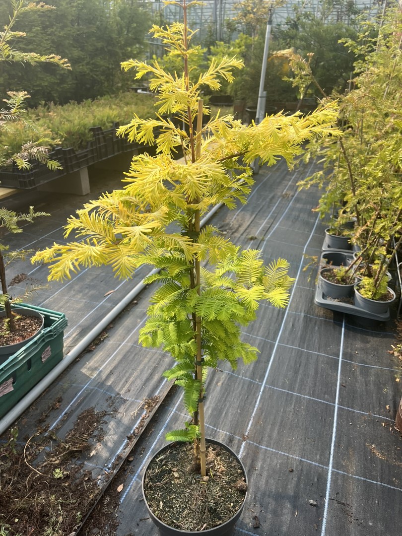Dawn Redwood ‘Golden Oji’ is easy to grow and maintain. They prefer moisture-retentive soil but will cope with most conditions once established. Plant in bright indirect light or partial shade, avoiding direct sun which can damage the distinctive golden foliage of ‘Golden Oji’. Consider ‘Amber Glow’ if you want to plant in direct sun. Choose a spot with enough space for their eventual height. They’re hardy throughout Britain and don’t mind exposed sites. Water regularly in the first few years and add a thick mulch around the base each spring. No regular pruning is needed as they naturally form an elegant shape.