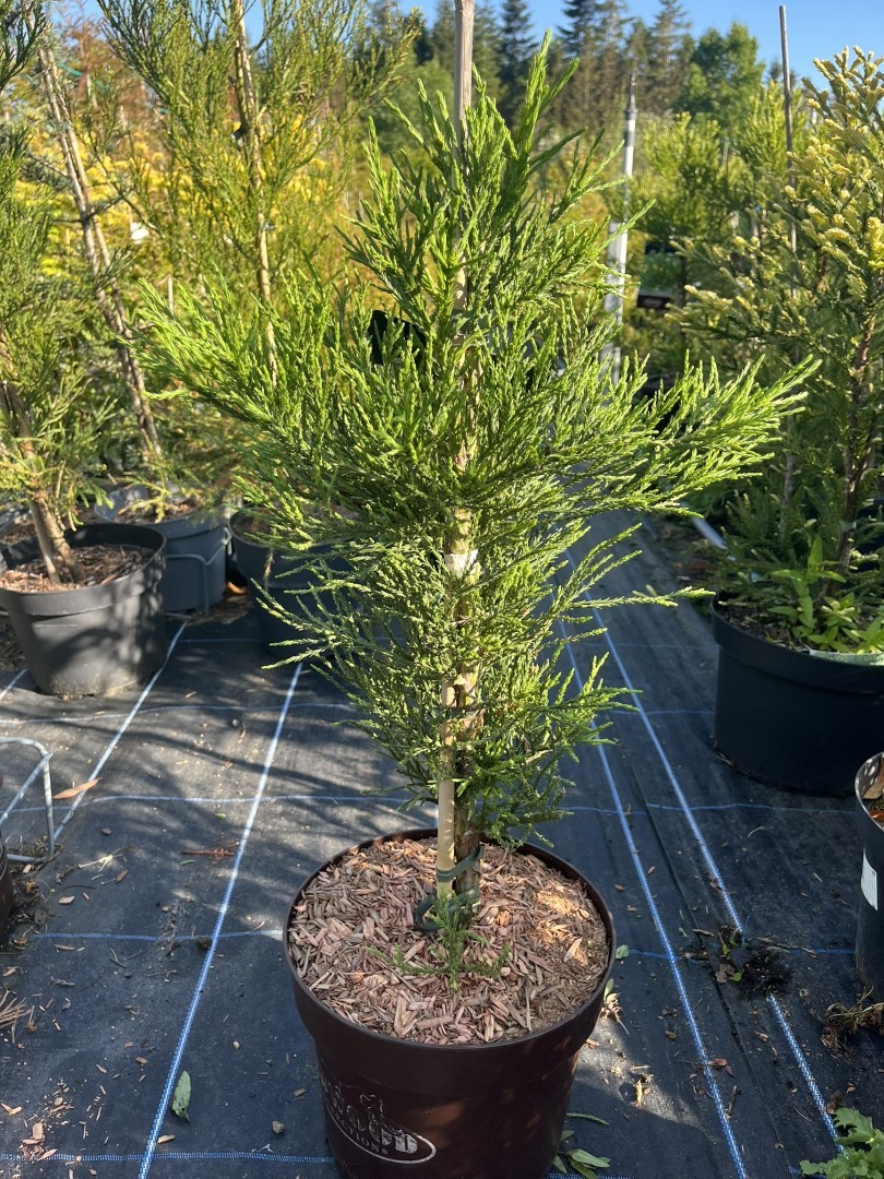 Growing at a more measured pace than the species, this tree develops into a beautifully proportioned conical shape. Its slower growth rate makes it more manageable in larger gardens, whilst still offering the impressive presence associated with Giant Redwoods.